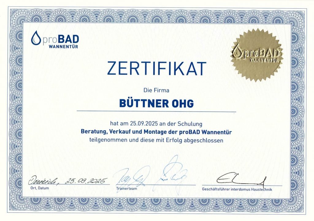 Die Büttner OHG hat erfolgreich an der Schulung für Beratung, Verkauf und Montage der proBAD Wannentür teilgenommen.