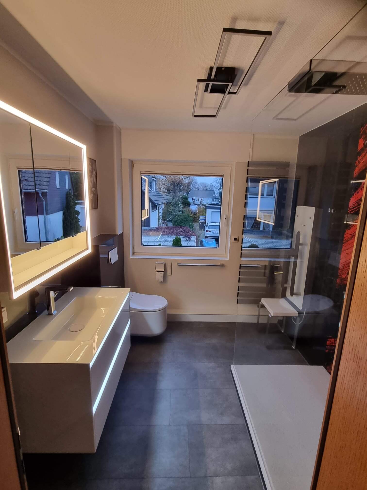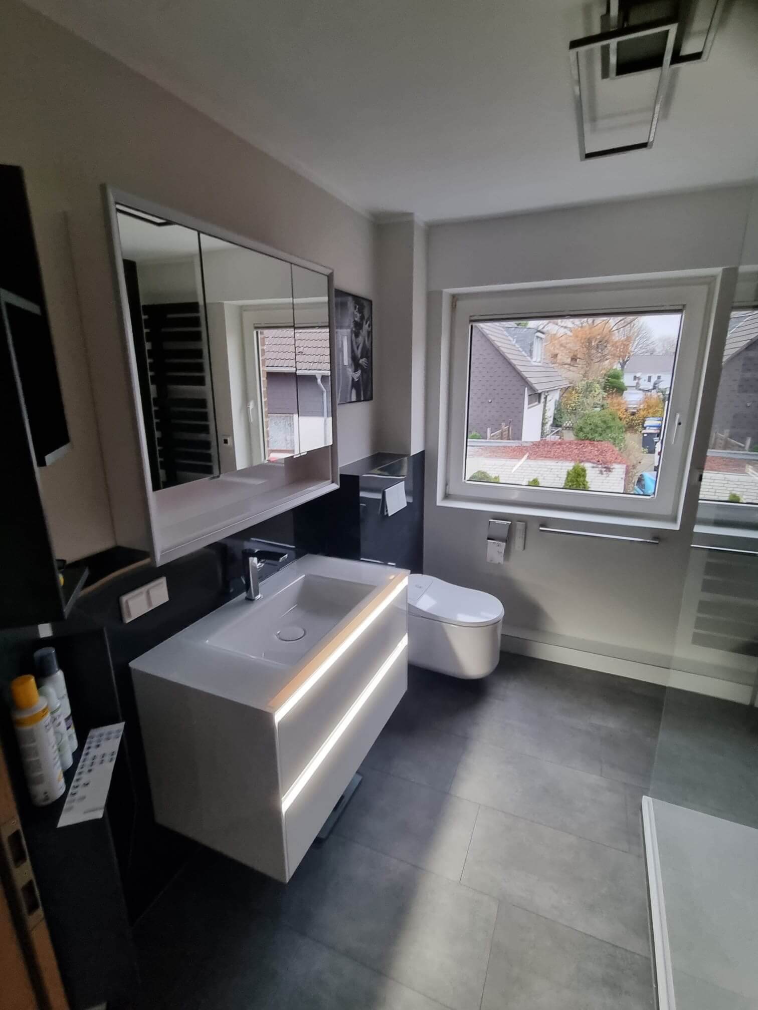 Der neue Waschtisch mit beleuchtetem Spiegelschrank fügt sich harmonisch in das moderne Konzept ein. Die integrierte LED-Beleuchtung setzt das Waschbecken elegant in Szene und sorgt für eine angenehme Lichtstimmung.