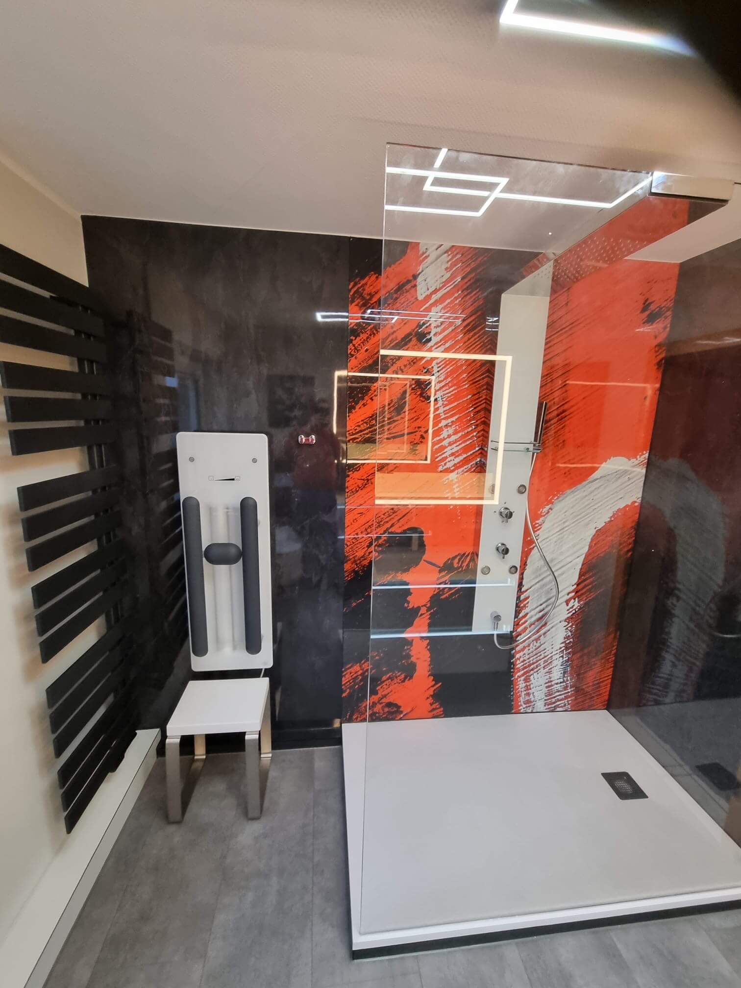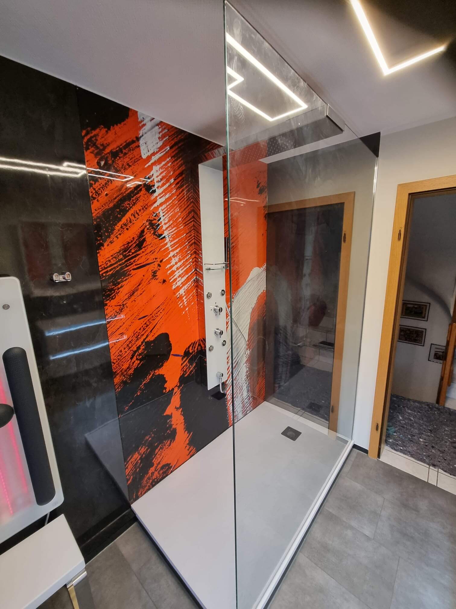 Der alte Wannenbereich wurde durch eine großzügige, begehbare Dusche ersetzt. Die bodengleiche Duschfläche von HSK sorgt für Barrierefreiheit und ein offenes Raumgefühl. Ein besonderes Highlight ist die rückwandige Duschgestaltung in kräftigem Rot-Schwarz-Dekor, die dem Raum Charakter und Dynamik verleiht. Hochwertige Armaturen von Hansgrohe und die präzise Installation von Viega-Systemkomponenten garantieren Funktionalität auf höchstem Niveau.