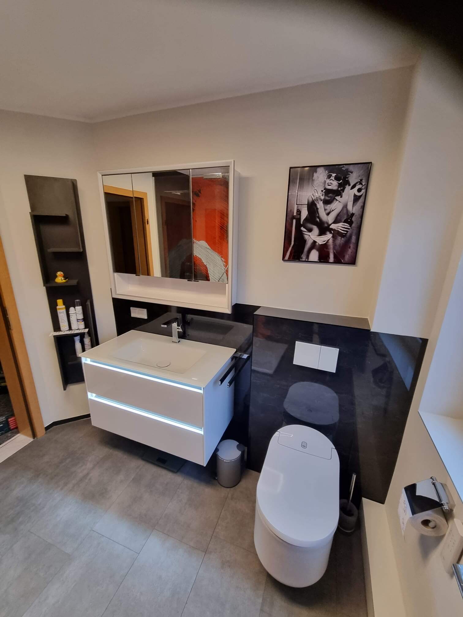Auch die technischen Details überzeugen: ein modernes Dusch-WC, eine durchdachte Raumaufteilung und ein Mix aus matten und glänzenden Oberflächen schaffen Komfort und Design in perfekter Balance.
